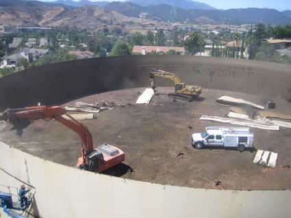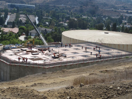 The existing Calleguas Municipal Water District 7.0 MG steel tank, located in the City of Thousand Oaks, required seismic retrofit and re-coating as recommended by Perliter & Ingalsbe in a previously completed study. It was also found that the reservoir is not situated at the optimal elevation to meet imminent and future hydraulic requirements of the system. The District's staff determined to demolish the existing 40' high steel tank and construct two new buried concrete reservoirs with a total capacity of 7.0 MG at a higher elevation with 20' water depths to maximize usage.